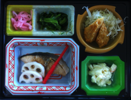 鰆の照り焼き ハムカツ お浸し マカロニサラダ お漬物 ご飯 味噌椀